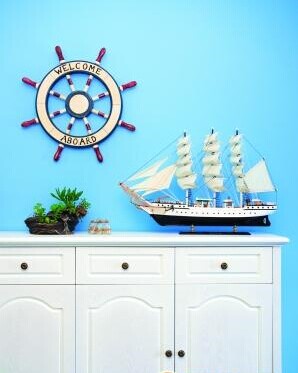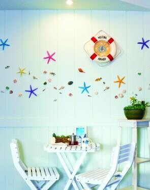 在家居設(shè)計(jì)中,小部件往往是畫龍點(diǎn)睛之筆。例如本案餐桌旁白色的石膏護(hù)墻板難免有些單調(diào),設(shè)計(jì)師就挑選一些色彩亮麗的海星、小魚、貝殼和其它海洋動(dòng)植物模型,把它們粘貼在墻上,既豐富了房間的色彩也讓主人感到真的像生活在海邊一樣。