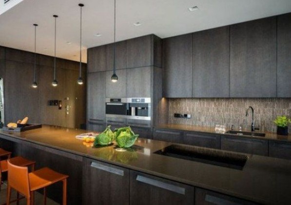 一字型的櫥柜時(shí)最不占地方一起又對(duì)比有用的櫥柜類型。將墻面空間徹底占有之后還能留下滿足回身的空間以及一個(gè)長(zhǎng)條形的用餐區(qū)和操作臺(tái)的結(jié)合部,一箭雙雕的規(guī)劃。黑色的木質(zhì)紋理外表也是讓整個(gè)廚房讓人愛(ài)不釋手的緣由地點(diǎn)。