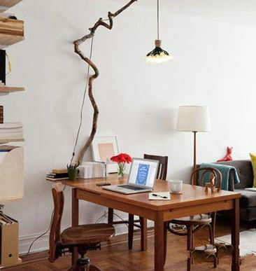 在客廳的一角形成書房,整個(gè)設(shè)計(jì)最讓人眼前一亮的是,運(yùn)用天然彎曲的樹枝與吊燈的完美結(jié)合,搭配著原始木質(zhì)材料的轉(zhuǎn)椅,仿佛帶來了大自然的氣息,文藝范兒十足。