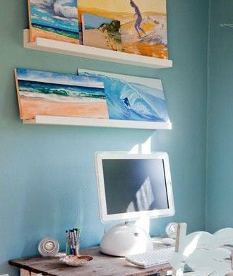 整個(gè)墻面都涂成了淡淡地藍(lán)色,墻上的裝飾畫展現(xiàn)了在海上沖浪的豪情,大海的氣息撲面而來,簡(jiǎn)單的一張桌子,一把椅子,一臺(tái)電腦,滿足主人的所有需要。