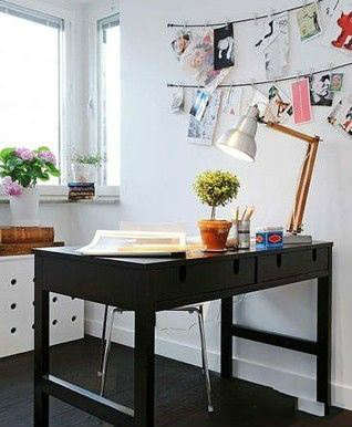 墻面上別出心裁用繩子將照片掛上,讓人想到以前的洗照片間的懸掛著的照片,帶著悠悠的文藝氣質(zhì)。黑色的書桌與地板的顏色相協(xié)調(diào)。墻邊上的低柜上的粉紅色的小花,透著春的芬芳。