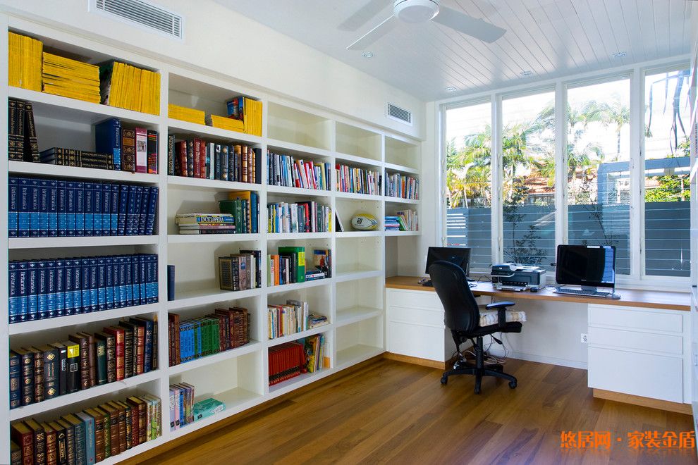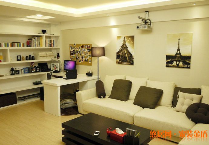4、 頂天的貼墻書架充分利用了墻面的高度,木質(zhì)材料營造出一種溫馨的氣氛。書架里的隔板在設(shè)計時可以自由組合,如果將其作為電視背景墻,需要提前為影音設(shè)備預(yù)留空間,如果放置些家居裝飾品,美觀之余,又巧妙的與實用功能相結(jié)合。