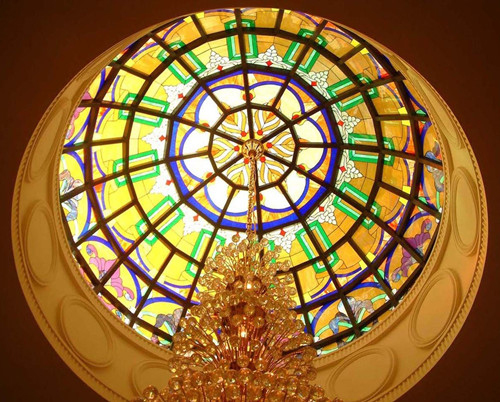 客廳天花板-彩繪玻璃,天花板材料中的彩繪玻璃,這種玻璃材質(zhì)的材料它的花色多樣,圖案多變。同時(shí)內(nèi)部還可以安裝照明設(shè)施,具有很好的透光性。但玻璃這種材料一般在天花板的小部分地方使用和局部的一些造型裝飾,彩繪玻璃的裝飾一般都會(huì)同輕鋼龍骨石膏板或膠合板共同來進(jìn)行裝飾。這樣會(huì)使整個(gè)天花板的造型更加的好看,更具有裝飾性。
