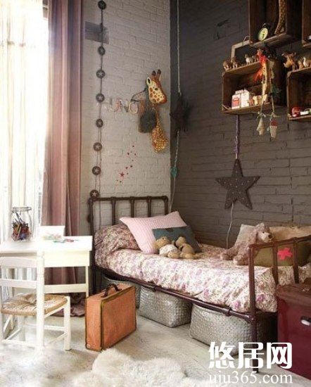 LOFT的這個(gè)兒童房是不是很粗獷?你看這個(gè)裸裝的墻面,你看這個(gè)鐵藝的床架,你看這個(gè)古舊的收納盒,整個(gè)空間充滿了個(gè)性元素。而布置在空間里的長頸鹿飾品,小熊布玩偶等,仿佛置身于極具自然氣息的野外,讓孩子與自然無界。