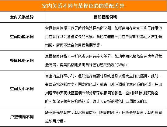 裝修的色彩搭配要考慮與室內(nèi)其他關(guān)系的協(xié)調(diào),主要包括空間功能、整體風(fēng)格、空間大小、戶型朝向四方面的影響。