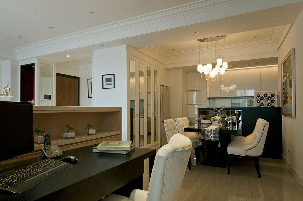 雙面柜施以線(xiàn)板造型,呼應(yīng)整體的新古典表現(xiàn)。