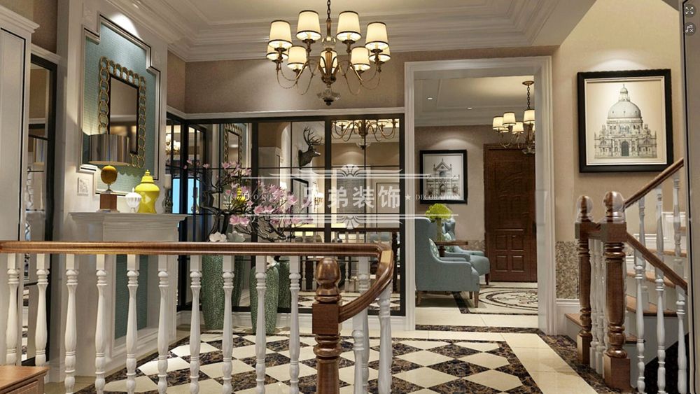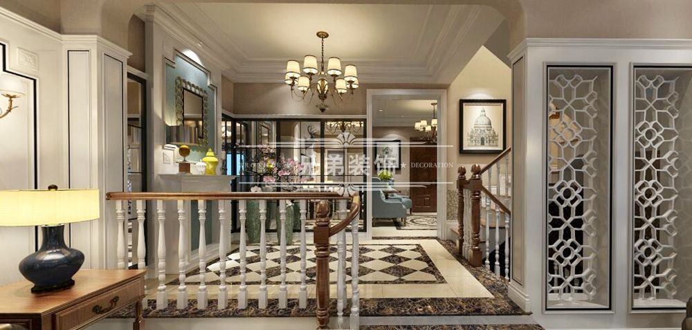 3、客廳與樓梯間則用半隔斷雕花處理,讓身處客廳的人可以一覽客廳與樓梯的通透空間,使得視野得到了最大限度的擴(kuò)張