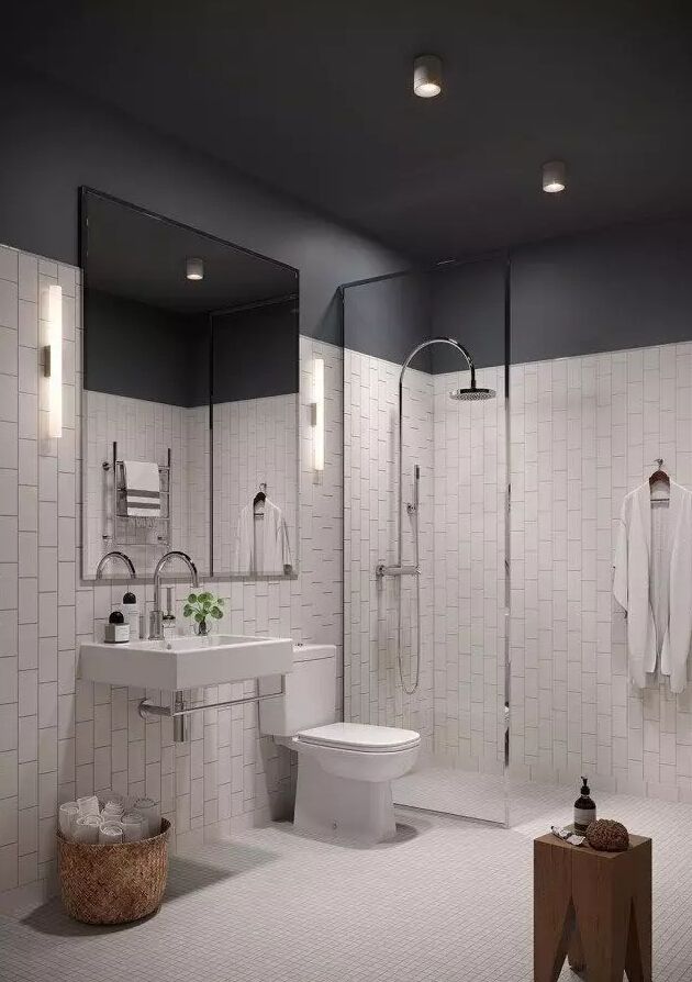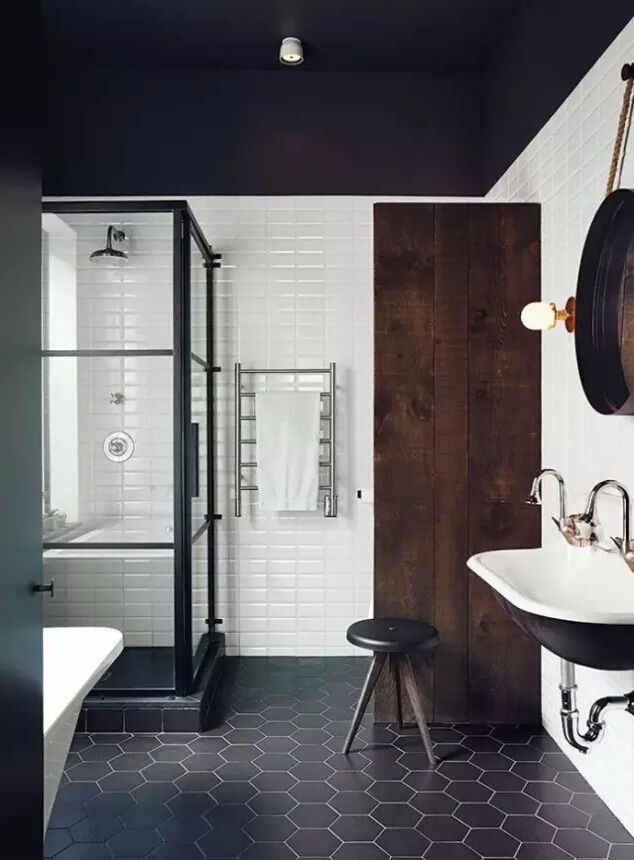 黑白衛(wèi)浴間比較常見(jiàn)的是將黑色用于地板或天花板。衛(wèi)浴間一般空間較小,墻面用純黑會(huì)比較壓抑。