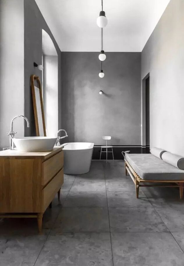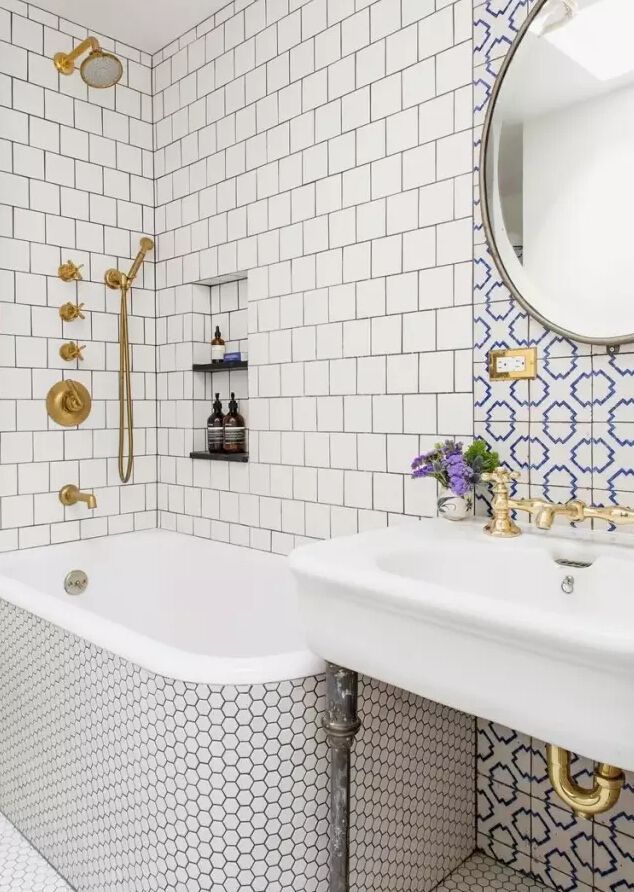 視覺(jué)效果強(qiáng)烈的花磚可以適當(dāng)在墻面上做些點(diǎn)綴。注意留白,否則過(guò)于紛亂,打擾了泡澡時(shí)安逸的思緒。