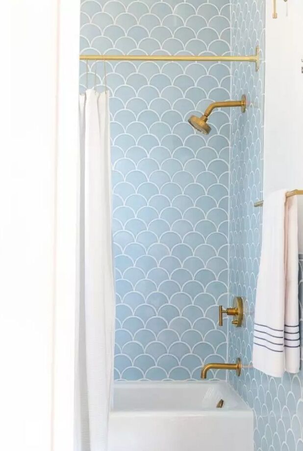 天藍(lán)色魚(yú)鱗紋磚更夢(mèng)幻童真,在這種氛圍下或許更能激發(fā)想象力,洗個(gè)澡靈感涌現(xiàn)什么的。