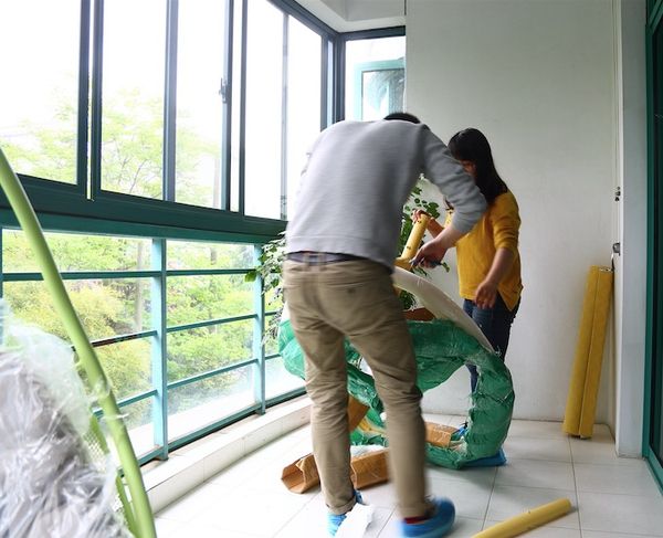 將桌椅、花草都擺好后,朋友開始在墻上打洞