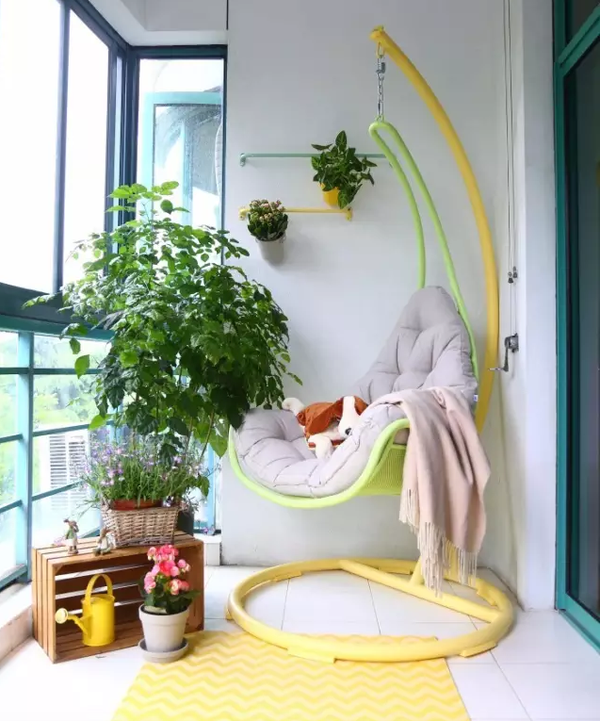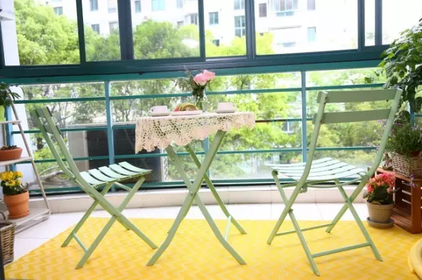 為了襯托陽臺的綠意,裝了黃色地毯與桌布