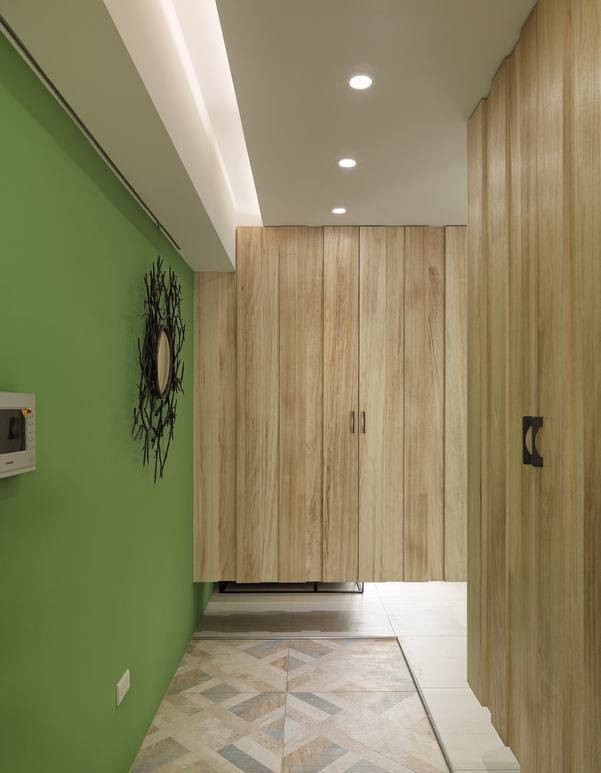推開訂制大門,梧桐木架構(gòu)起足量的鞋柜收納,而地坪上瓷磚選材低調(diào)定義了玄關(guān)界線。