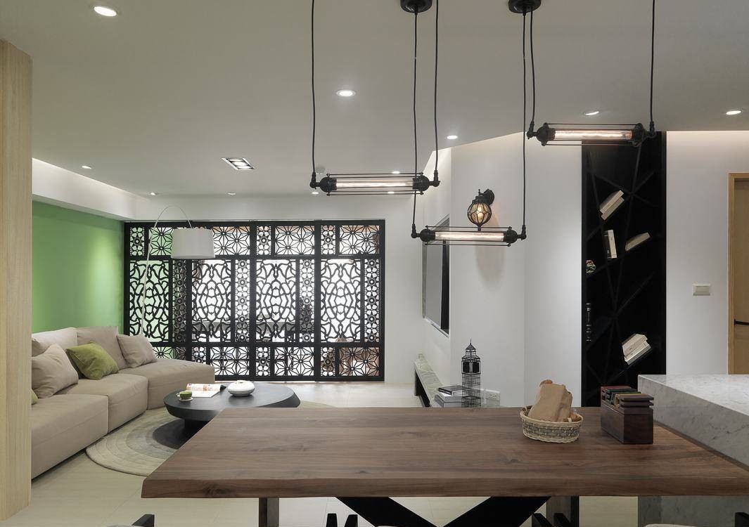 推開雕花拉門中介,采光清透入客廳公領(lǐng)域,大L型的收納柜體在視覺中由壁至天轉(zhuǎn)折出精彩層次。
