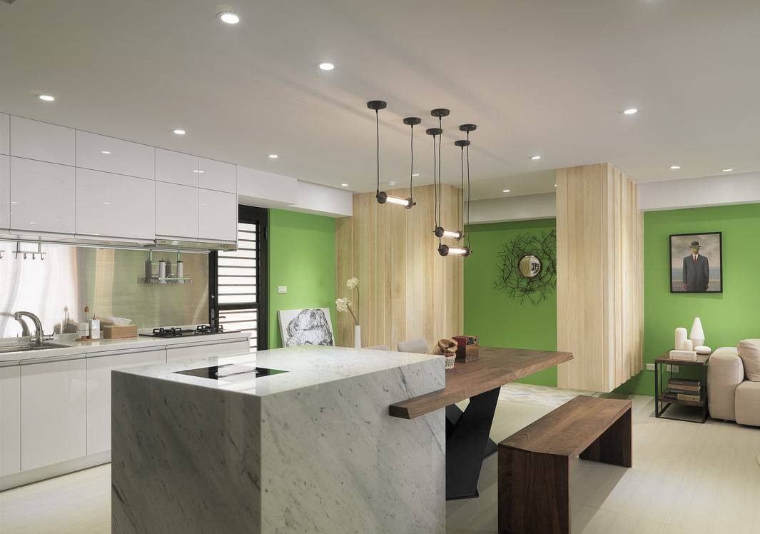 原木餐桌嵌上大理石吧臺(tái),異材質(zhì)的沖突結(jié)合上特殊桌腳設(shè)計(jì),搶眼聚焦空間軸心。