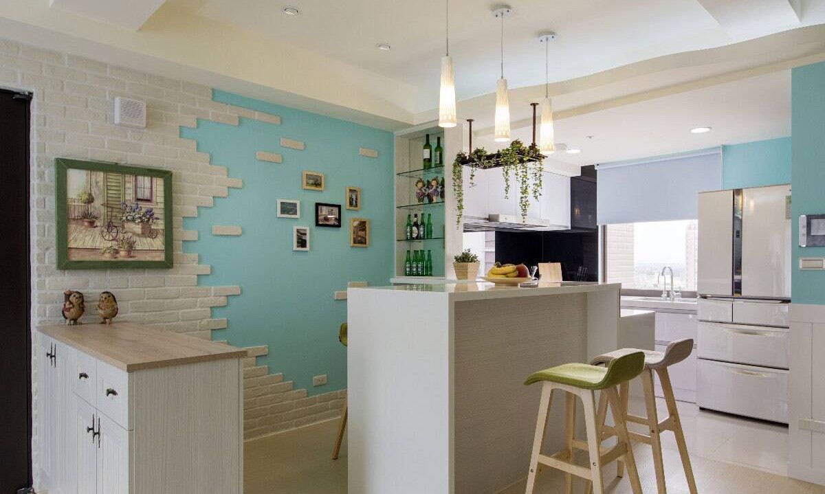 采用文化石拼貼的電視墻面往玄關(guān)拓展,直到吧臺(tái)區(qū)斑駁出藍(lán)色主墻,呈現(xiàn)大器的視覺(jué)效果。