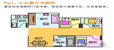 餐桌切忌被廁所門直沖。餐桌是家人進食的口福之處,而廁所是“出穢”的不潔之地,彼此直對當然不吉,容易“病從口入”,導(dǎo)致家人健康不良,所以應(yīng)該要避免。