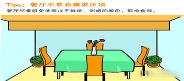 餐桌上方宜平忌壓。若上方屋頂傾斜不平或橫梁壓頂,或位于樓梯底下,均會對家人健康有損,必須設(shè)法避免. 橫梁成煞,幾乎略懂風水的人都知道。但橫梁所壓者不同,便有不同的影響,如飯桌上方有橫梁,便做成橫梁壓飯桌了。這會妨礙人的消化能力,久而久之,便招致腸胃病了。