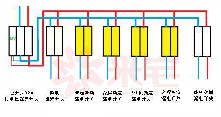 我家由于使用了燃?xì)鉄崴?,衛(wèi)生間的漏電開關(guān)沒有選擇高靈敏的10mA的型號(hào),照明回路和壁掛空調(diào)沒有選用漏電保護(hù)開關(guān)。該方案算是要求比較嚴(yán)格的配置了。