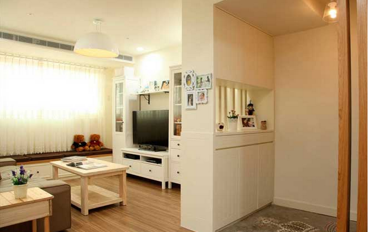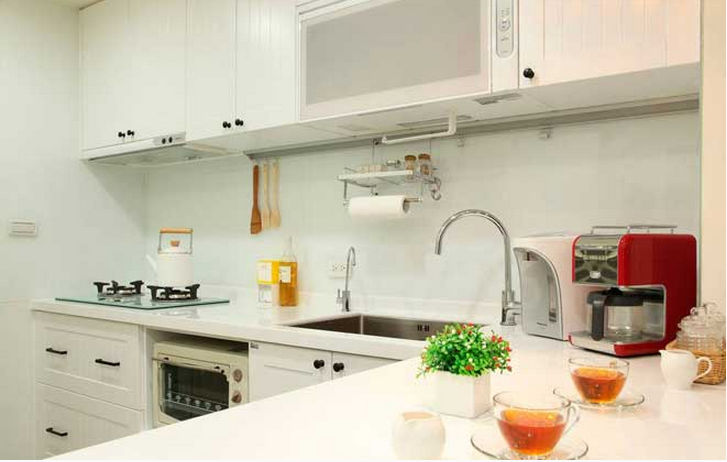 構(gòu)筑一處以白色為基底的幸福居宅,并注入清新感的鄉(xiāng)村風(fēng)語(yǔ)匯,讓滿室呈現(xiàn)舒緩的空間暖意。在僅有56平的小小天地中,保留最大的空間給最愛(ài)的家人,除了將客、餐廳連貫,增加小孩的游戲空間,并將原有的廚房隔間打掉,以開放式、中島吧臺(tái)的餐廚空間來(lái)表現(xiàn)。