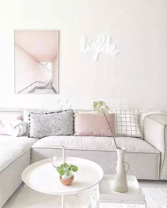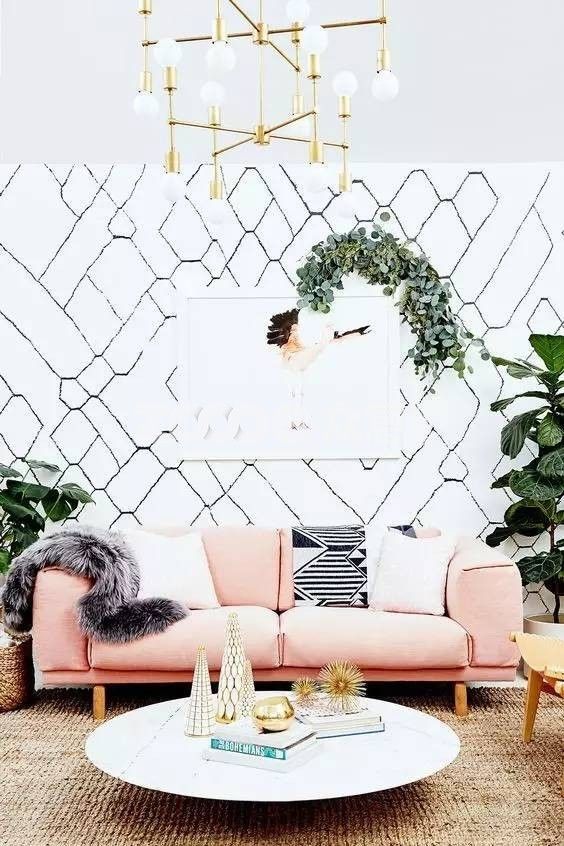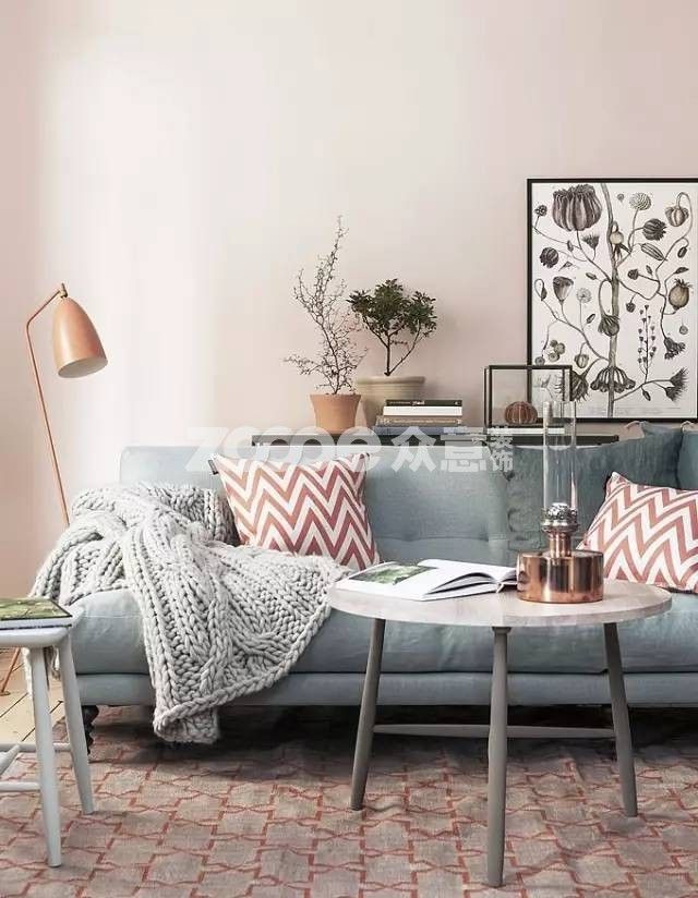 ▲拿這張圖來說,淡淡的橘粉色墻面,配上稍微深一級的抱枕和地毯,再加洋氣的Grasshopper落地燈來添彩,形成了有層次的暖色過渡,是一種不單調的和諧感。