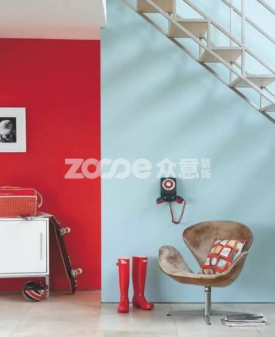 ▲可以搭配出非常美的撞色效果。撞色不能用純度都高的顏色去撞,那樣總給人一種兩敗俱傷的感覺,沖擊力是夠了但并不賞心悅目。你看,紅色是完全鮮艷的,但是藍色用得很輕。清新柔和的水藍色一出現(xiàn),立刻就把用色艷俗的高風險給降了下來,整個空間平衡得恰到好處。