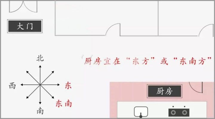 廚房宜在東方,所謂“紫氣東來”,“紫氣”便是財氣,廚房放在這個方位是利財?shù)?。東方為八卦中的震卦,五行屬木,而廚房五行屬火,呈木火相生之象,特別適合在此方位設(shè)置廚房或者餐廳,有利于家人的財運和健康。且東方是日出的方向,適當(dāng)?shù)奶柲芰窟€能保證廚房的干燥,減少陰濕,有利于居住者的健康。東南方為八卦中的巽卦,五行亦屬木,同理,也特別適合把廚房安置在這個方位。
