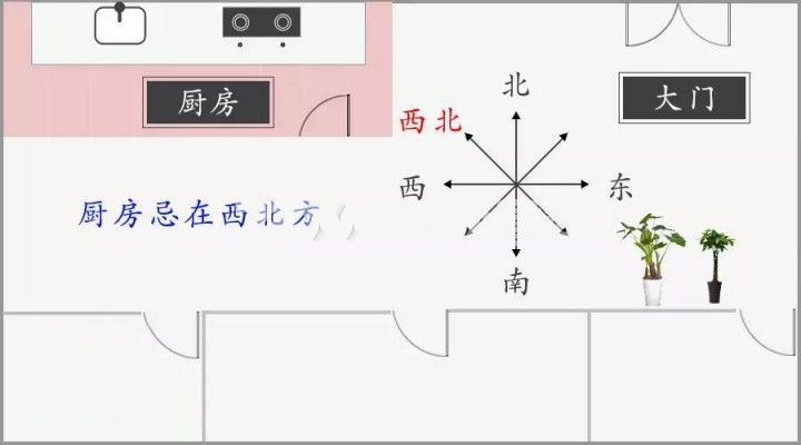 西北方為八卦中的乾卦,五行屬金,而廚房五行屬火,若設(shè)置在西北方,就會呈金火相戰(zhàn)之象,“火克金,易操心”。此布局還形成了風(fēng)水中常講的“火燒天門”格局,其中“火”為廚房,代表家中的女主人;“天門”指西北方,代表家中的男主人。如此布局不僅會導(dǎo)致財運破敗,還會造成婚姻危機,同時也不利于男主人的身體健康,容易患肺部、心臟方面的疾病。因此,最好讓廚房避開家宅的西北方。如果廚房已經(jīng)在家宅的西北方,可用五行通關(guān)法來化解。