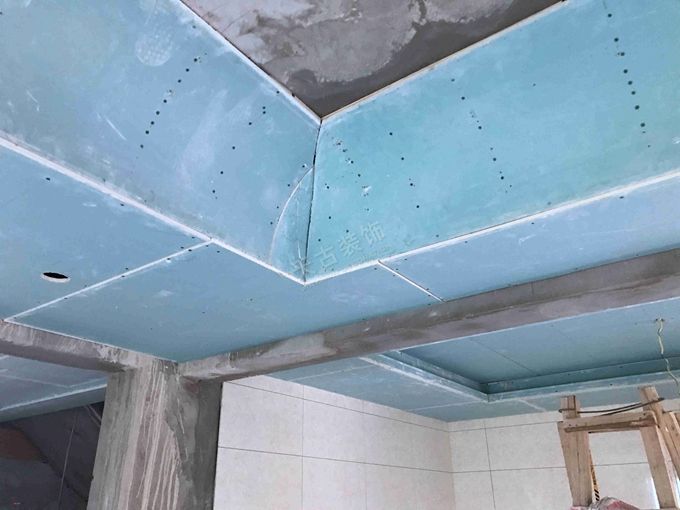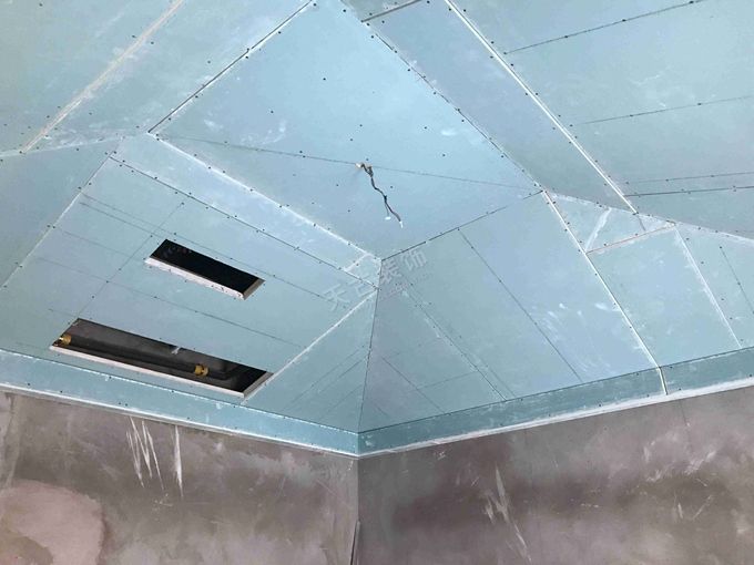 天古渝派精工·七字拼接工藝:轉角處整板安裝。石膏板安裝時,在轉角、十字交角及T字交角處拼接,均必須使用整板安裝以達到減小應力、避免開裂的目的。