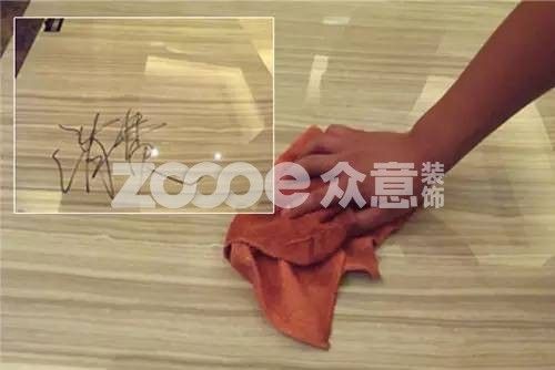 這一步主要考察的是瓷磚的耐污性,要知道,瓷磚將會(huì)陪伴我們一段好長的生活時(shí)間。如果臟了不容易清洗的話,估計(jì)不到三、四年,連自己也不想呆在臟臟的家里,恨不得馬上把這些瓷磚翹起重鋪。其實(shí),做這個(gè)防污測試非常簡單,只需要在瓷磚表面寫上幾個(gè)大字,等一會(huì)墨水干了,看看是否容易清洗掉,如果留有墨跡的話,建議大家還是另選一款好的。