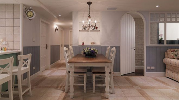 客廳與餐廳與廚房處在一條直線上,視野上沒有任何阻礙,顏色過度自然,由原木色過度至溫暖的粉藍(lán)色,仿佛被暖暖的棉花包圍,柔軟又溫暖。餐桌頂上的燭臺(tái)樣式吊燈,暖黃色的燈光,更添溫暖的居住感覺。