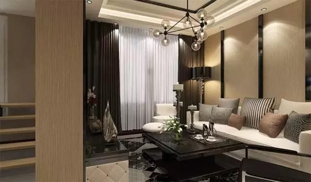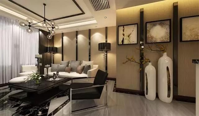 港式風(fēng)格客廳布置簡(jiǎn)潔自然,色彩和諧,整體色調(diào)為暖棕,乳白色系沙發(fā)搭配深黑色落地?zé)襞c茶幾座,深淺合宜,加大的裝飾花瓶和掛畫(huà)的設(shè)計(jì)為客廳布置增添時(shí)尚感。