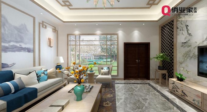 設計師在客廳空間的裝修設計以簡約的造型為基礎,添加中式元素,使客廳空間色彩清爽,通透寬敞,大而不空,有品味卻又不顯壓抑。