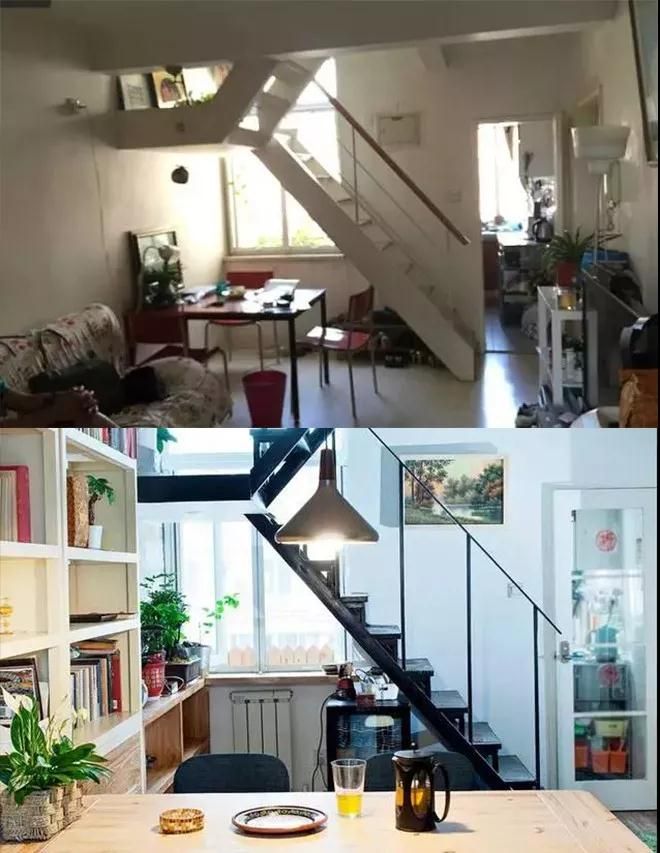 改造后:保留原來樓梯的鋼架結(jié)構(gòu),去除厚重外殼,涂刷黑漆,利落的線條讓整個(gè)空間更立體。