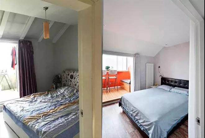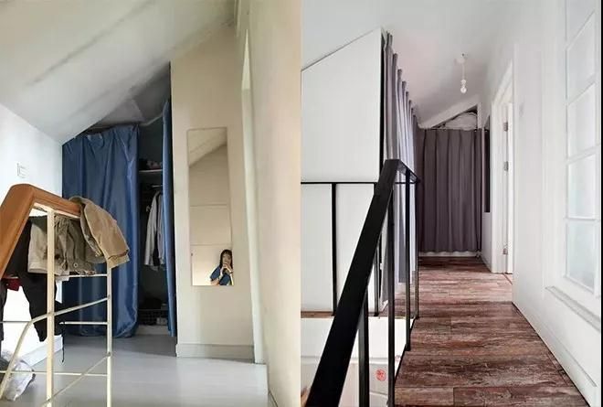 改造前:原先的衣柜,設(shè)置在臥室的門口位置,一個(gè)斜坡的夾角,空間容量小,以至于業(yè)主的很多衣服都直接搭在樓梯扶手上,另外穿衣鏡的位置設(shè)計(jì)不安全,后退幾部就是樓梯,容易踏空。