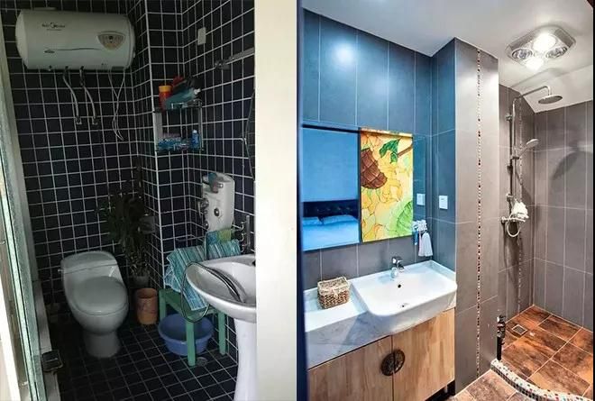 以前暗沉沉的黑白馬賽克瓷磚也換位了大塊灰色和藍(lán)色的組合,配以木質(zhì)洗手臺(tái),整個(gè)空間亮起來了。