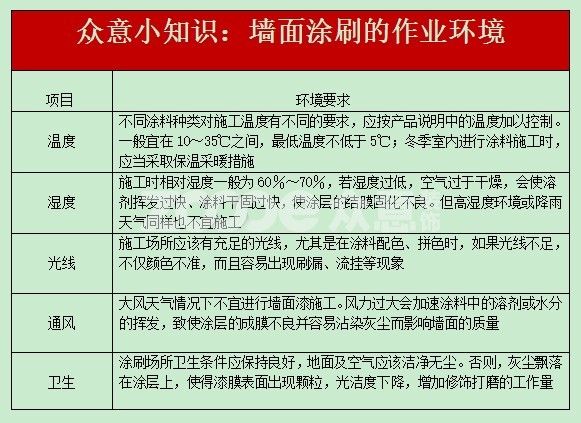 墻面漆涂刷是一項十分精確細致的話,對施工環(huán)境有著嚴格的要求。施工場所的溫度、濕度要合適,衛(wèi)生條件、光線條件以及通風條件要好。為了刷出最完美的墻面,家裝朋友們最好在比較適宜的環(huán)境下進行施工。