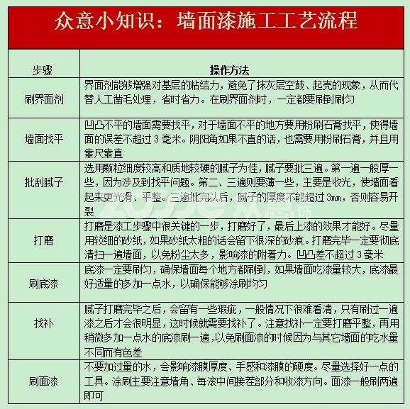 墻面漆施工的流程主要上面這些步驟,依次是刷界面劑、墻面找平、批刮膩子、打磨墻面、刷底漆、墻面找補、刷面漆。每一個步驟都有其操作方法和施工要求,墻面涂刷時需要按照具體的要求,把每一步都做好。