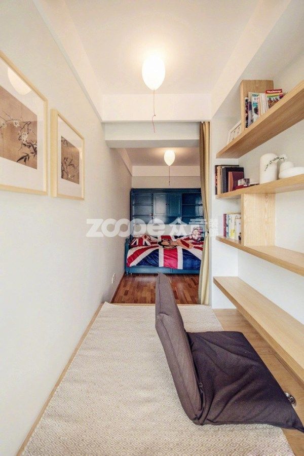 兒童房的原木元素則是體現(xiàn)在裝飾畫得邊框,窗戶旁邊的榻榻米,還有一整面墻的收納柜上,只要在榻榻米上鋪上一塊軟綿綿的毯子,放上一個(gè)靠墊,就成了一個(gè)不錯(cuò)的書桌了。四層收納柜可以放置不少書本呢。