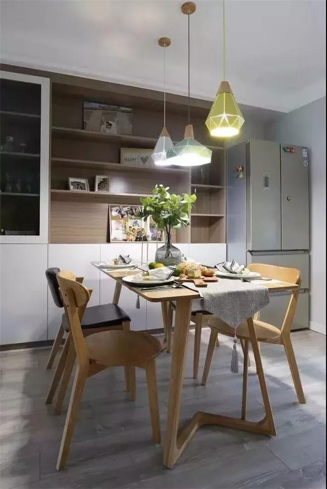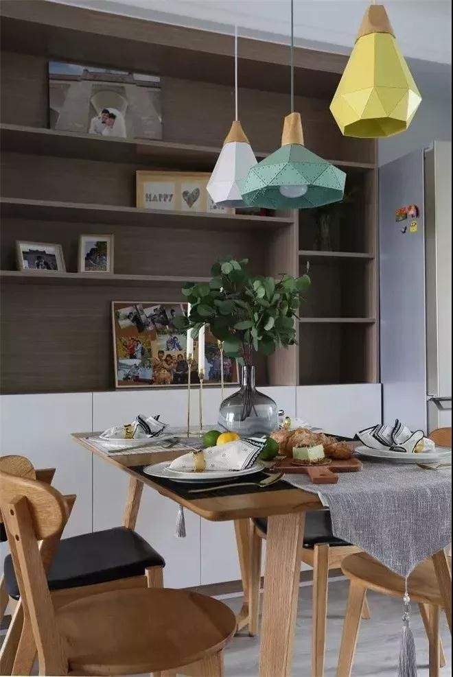 考慮到餐廳的實用功能性,在墻面上增加了4層儲物餐邊柜,鑲嵌式結(jié)構(gòu),即不會占據(jù)太多空間,又能全方位滿足收納功能。
