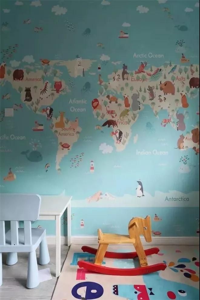 兒童房是明亮色淺藍(lán)色,墻面是貼的卡通版世界地圖,地圖不是以國家進行劃分,而是以小動物作為圖標(biāo),大象、小鳥、貓頭鷹等,都是小孩子喜歡的卡通形象。
