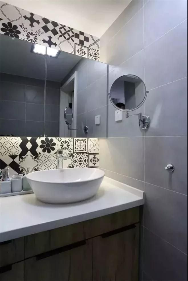 衛(wèi)生間做了明確的干濕分區(qū),洗手臺的位置是以黑白雙色花磚鋪就,底部是木質(zhì)洗手臺,方便收納。