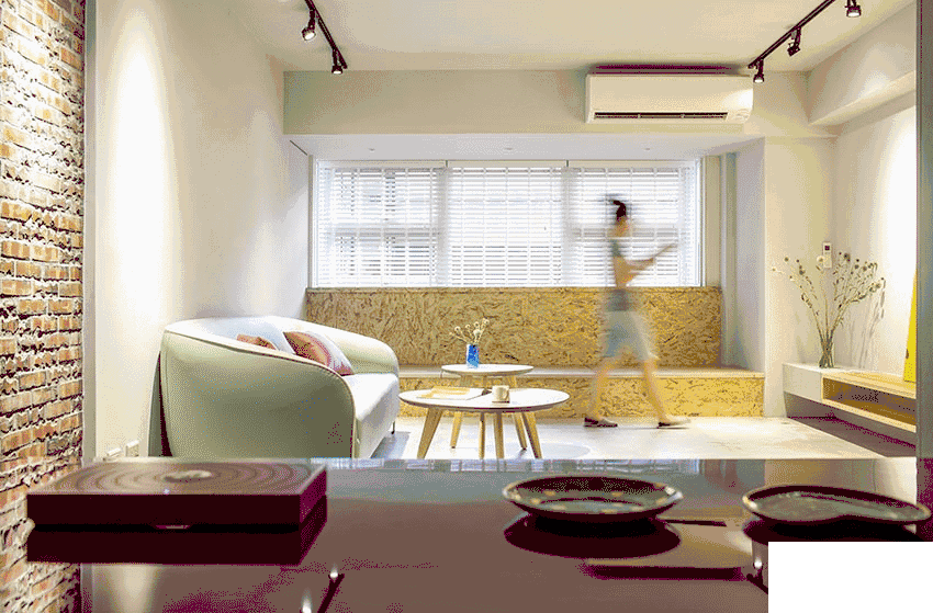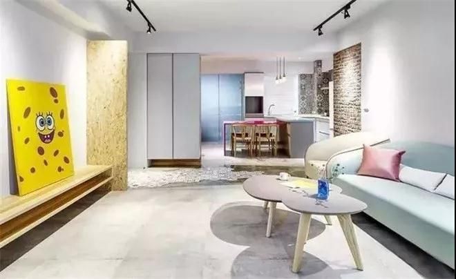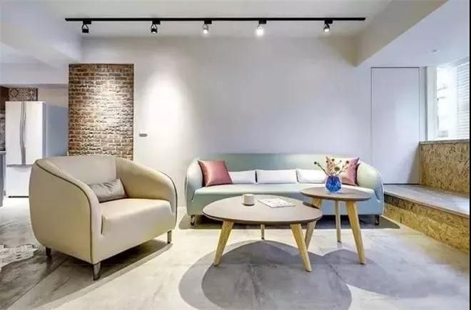 空間設(shè)計相當(dāng)簡潔,大白墻,低飽和色系沙發(fā),有種軟糯的感覺,適合小女生。