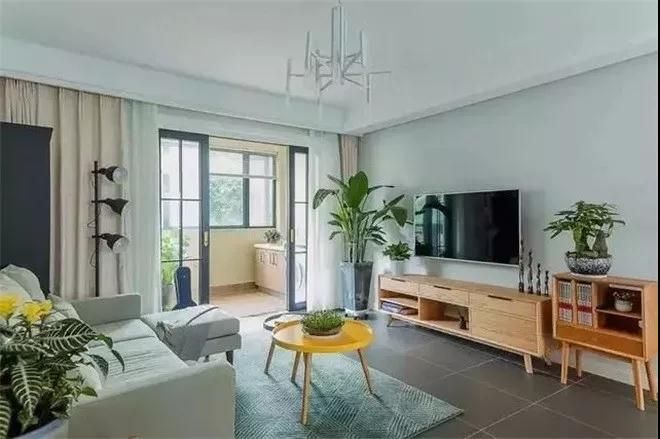 ▲房間顏色偏冷調(diào),是雅致的感覺(jué),電視柜和小邊柜,都是淺色原木風(fēng),配上盆景和大綠植,散發(fā)出濃濃的大自然氣息。深灰色地板也非常大氣呢。