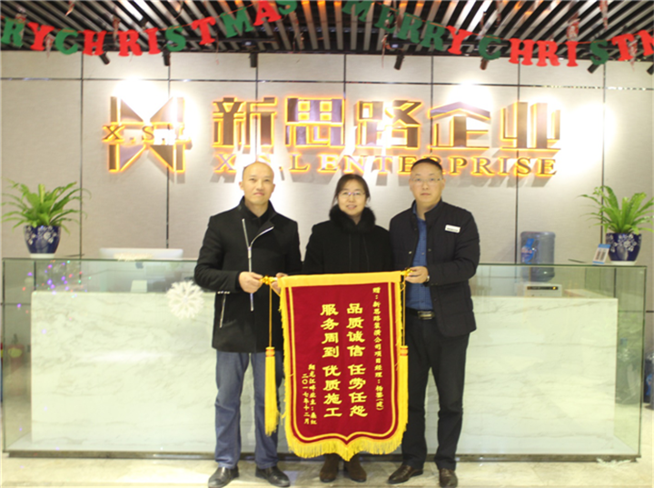 1221日,來自翔龍江畔的業(yè)主桑老師將一面印有“品質(zhì)誠信,任勞任怨,服務(wù)周到,優(yōu)質(zhì)施工”的大紅錦旗交到工程部文經(jīng)理手中,以感謝新思路裝飾精湛的施工工藝和高品質(zhì)的裝修服務(wù)。