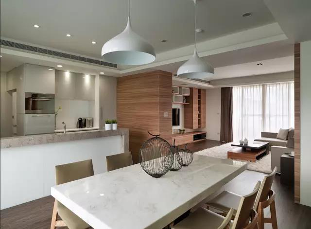 開放式的餐廳和客廳連接得恰到好處,通過原木包裹墻壁突出色彩的差異性,線條整齊流暢,裝修風格時尚而前衛(wèi)。