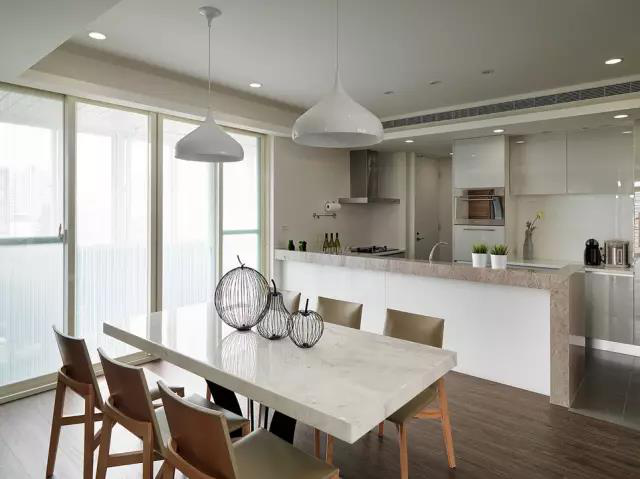 餐廳和廚房相連,大理石材質的餐桌面,木質的桌角以及餐椅,利用玻璃隔出一個小書房空間??臻g劃分和利用的非常好。