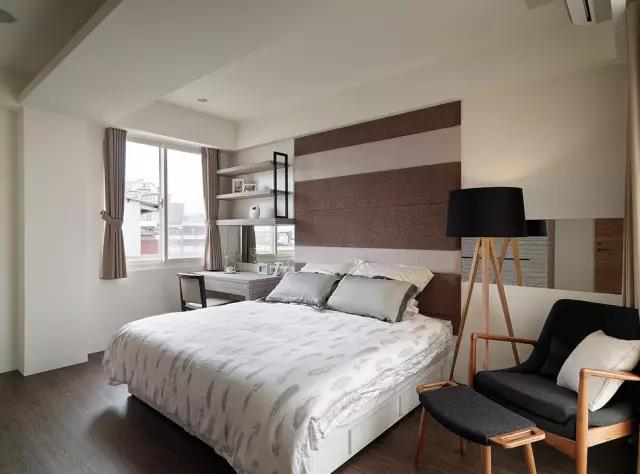 主臥的色彩偏向于成熟穩(wěn)重,窗戶邊的簡易桌子,可用作梳妝臺或者書桌,落地燈和椅子是同一系列的家具,構成了一個完美的閱讀區(qū)域。