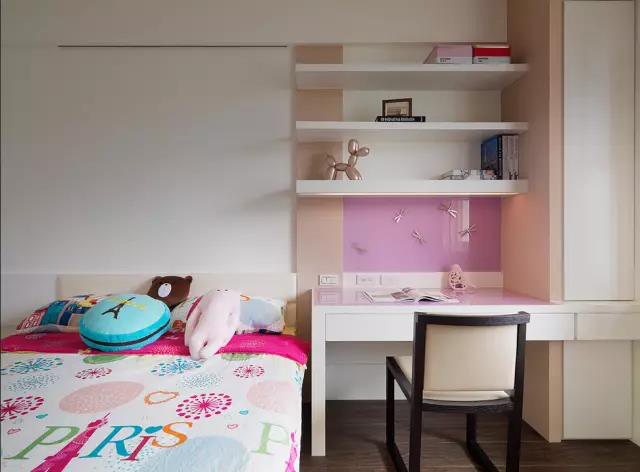 粉色系的兒童房,在小床的旁邊也打造了一個簡易的書桌,三條置物架上放置書籍和小擺設起到很好的裝飾作用。
