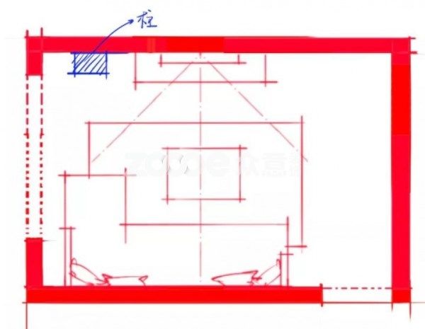 如上圖,當長邊的這一面墻有柱子的時候,若是擺沙發(fā)就要不能靠墻擺放了,這個時候有柱子的一側(cè)更適合做電視墻了。
